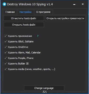 Наверное у каждого пользователя после обновления до 10 версии Виндовс встает вопрос о том, как отключить слежку в Windows 10. Ни для кого уже не секрет, что в новой операционной системе присутствует Keylogger, — приложение, которое записывает за юзером все то, что он набирает на своей клавиатуре. Ко всему прочему шпионаж еще и сводится к тому, что разработчикам отправляется ваша корреспонденция, личные данные и т.д и т.п. Утилита, которую я хочу сегодня представить вашему вниманию - Destroy Windows 10 Spying, удаляет с компьютера вышеописанную программу, лишние приложения (которые обычным способом не удаляются). Программа не требует установки. Скачиваем и запускаем. Перед началом лучше всего отключить антивирус. Он будет блокировать изменения.